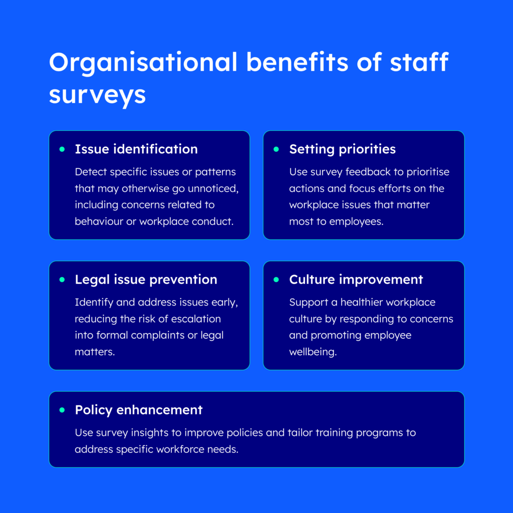 - Regular monitoring: Conduct surveys on a regular basis, whether annually or semi-annually, to consistently gauge the pulse of the workplace culture and identify any emerging issues related to sexual harassment.